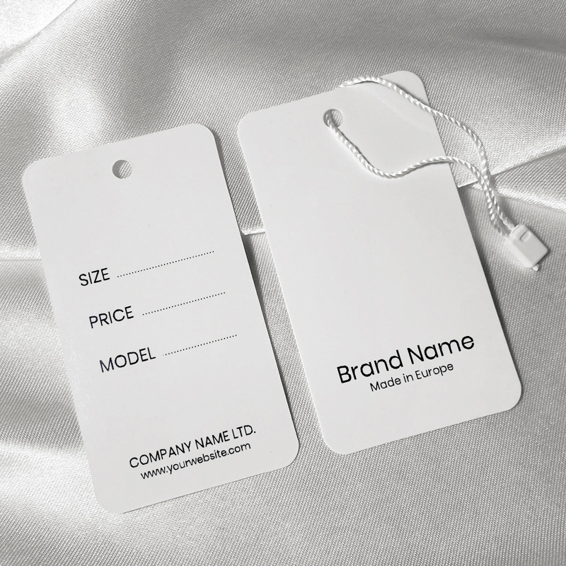 Etiqueta de la ropa hecha de cartón grueso laminado con papel de aluminio brillante y personalizada delantero/trasero con el nombre de la Marca o logotipo, provista de un sello con cordón para colgar en varias prendas. Este modelo de etiqueta está hecho de materiales de alta calidad, utilizando las tecnologías más avanzadas en el campo de la impresión digital y el acabado.