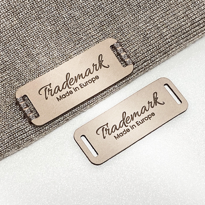 Etiqueta de marca en cuero natural EP-M69 para jeans, sudaderas, camperas, gorras, bolsos y otros, personalizada mediante grabado láser con el logo y datos del fabricante. Este modelo de etiqueta de cuero está fabricado en cuero natural de calidad superior, utilizando equipos de última generación y métodos profesionales de grabado o repujado láser.