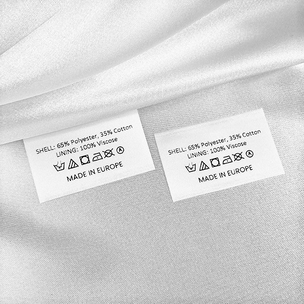 Etiqueta textil con símbolos de lavado y cuidado, e información sobre la composición del material, personalizada en un fino satén de alta calidad, cortado en caliente por ultrasonidos. Este modelo de etiqueta textil se fabrica utilizando las tecnologías más avanzadas en el campo de la impresión digital en medios textiles. Las etiquetas están impresas en satén especial, por el método de transferencia térmica, con una calidad de impresión impresionante y alta resistencia al lavado.