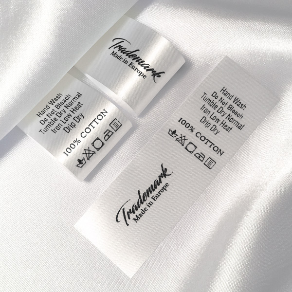 Etiqueta de composición para ropa, impresa Digital con escritura negra sobre satén blanco, perfecta para varias prendas de vestir. Este modelo de etiqueta textil se fabrica utilizando las tecnologías más avanzadas en el campo de la impresión digital en medios textiles. Las etiquetas están impresas en satén especial, por el método de transferencia térmica, con una calidad de impresión impresionante y alta resistencia al lavado.