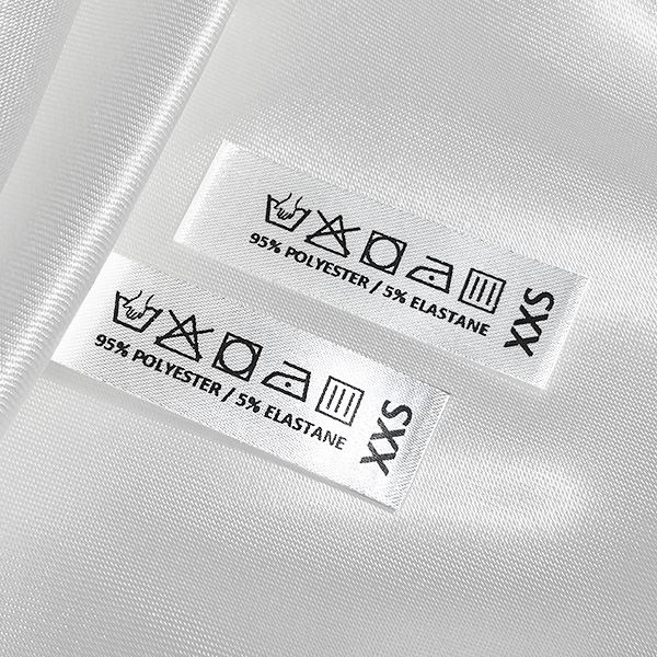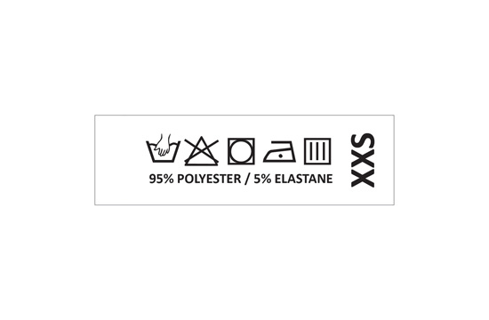 La etiqueta con símbolos de lavado y composición, con la indicación del tamaño de la prenda, hecha por encargo de material textil satinado con estampado negro. Este modelo de etiqueta textil se fabrica utilizando las tecnologías más avanzadas en el campo de la impresión digital en medios textiles. Las etiquetas están impresas en satén especial, por el método de transferencia térmica, con una calidad de impresión impresionante y alta resistencia al lavado.