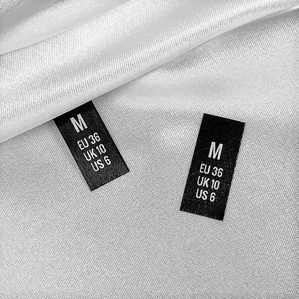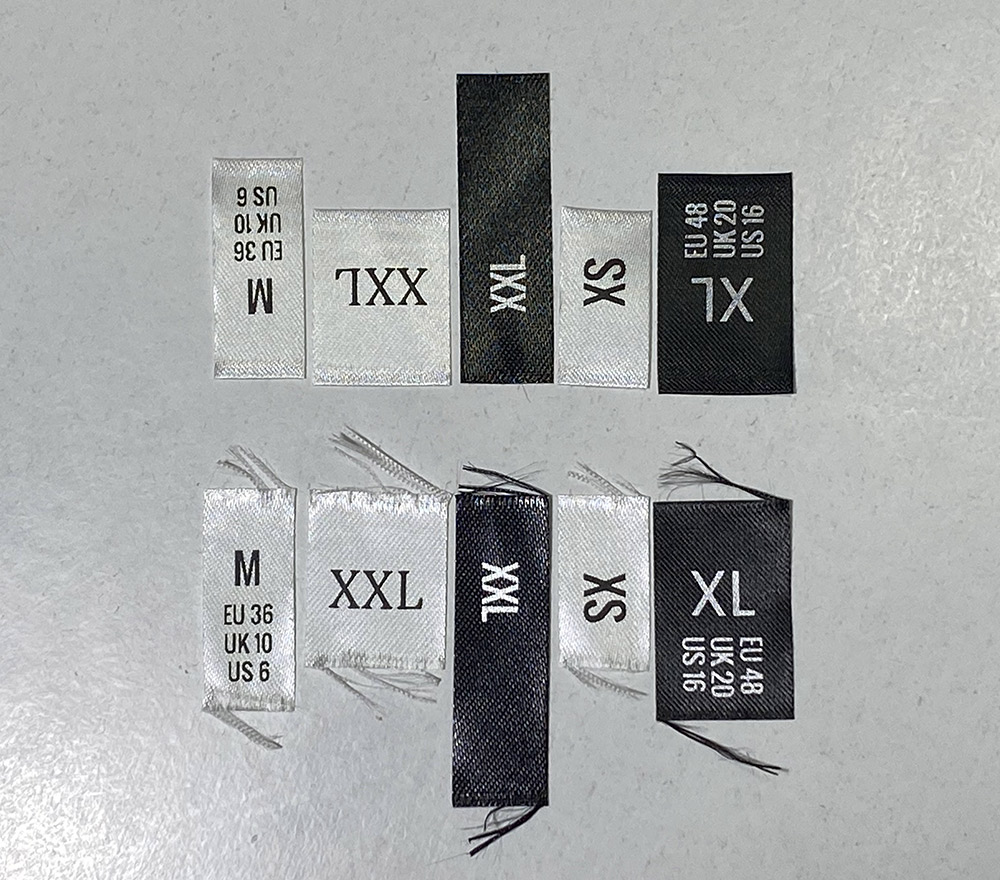 Etiquetas personalizadas con tallas, para coser en la ropa o en diversas prendas, hechas por encargo con material textil de alta calidad. Este modelo de etiqueta textil se fabrica utilizando las tecnologías más avanzadas en el campo de la impresión digital en medios textiles. Las etiquetas están impresas en satén especial, por el método de transferencia térmica, con una calidad de impresión impresionante y alta resistencia al lavado.