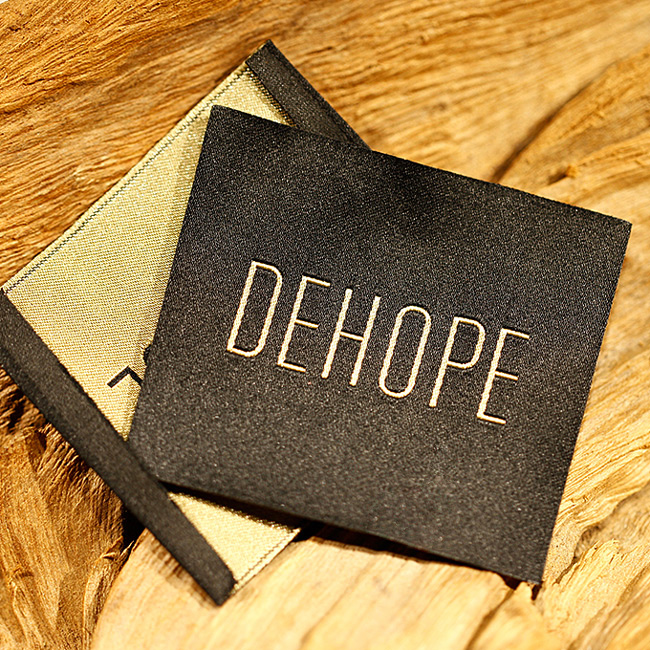 Etiqueta tejida modelo Tall Style con un diseño extremadamente elegante, personalizada con el nombre de la marca y un emblema en distintos colores, ideal para ropa elegante de damas y caballeros. Este modelo de etiqueta textil está hecho de materiales de alta calidad, utilizando las tecnologías más avanzadas en el campo del bordado digital a nivel industrial.