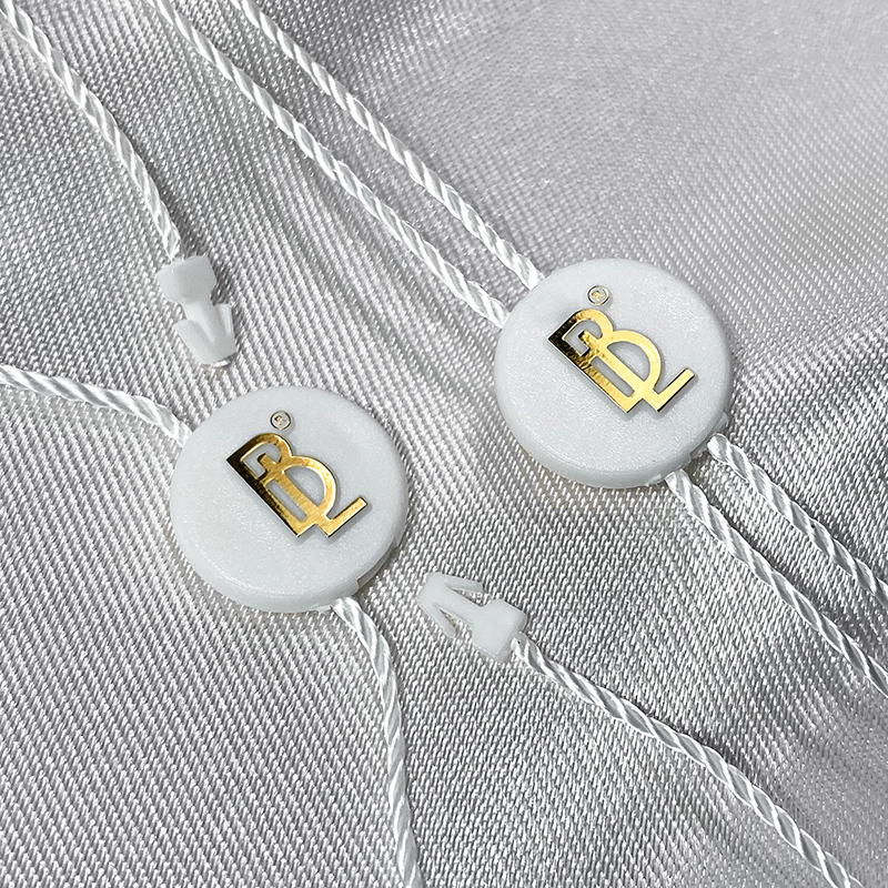 Sello de plástico ST-M34 con un diseño elegante, forma redonda, se puede personalizar en dos lados con el nombre de la marca o el emblema/marca registrada y es ideal para productos como ropa, bolsos, calzado. Este modelo de sello está hecho de materiales de alta calidad, utilizando las tecnologías más avanzadas en el campo.