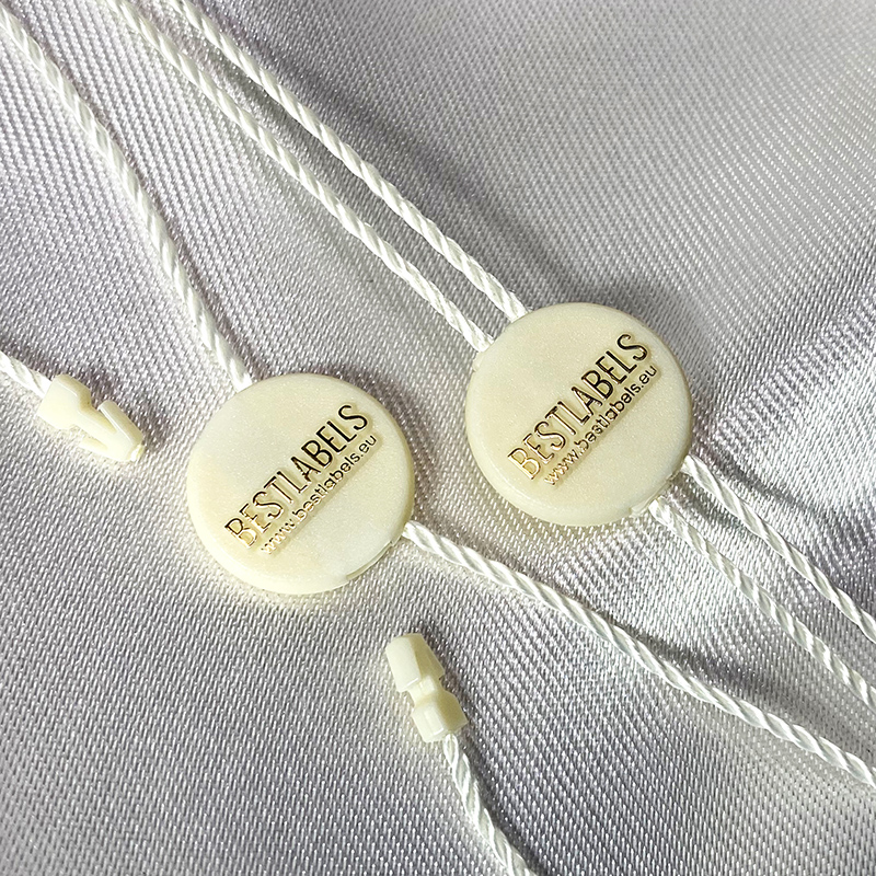 - Materiales: plástico (sello) y poliéster (cordón).