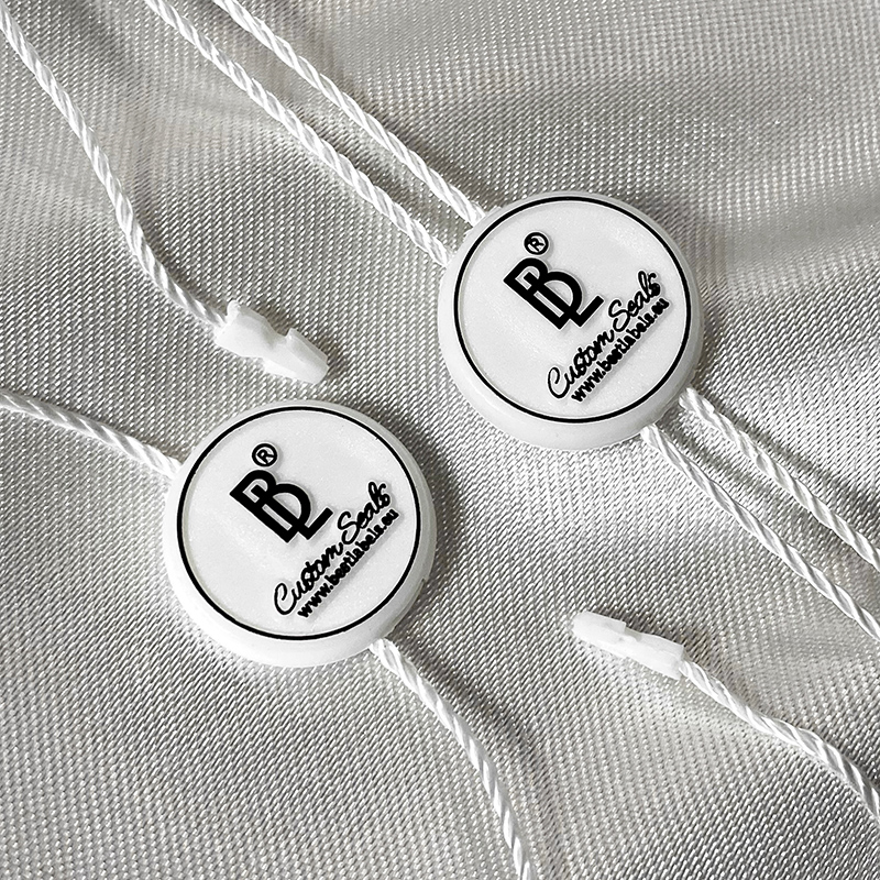 - Materiales: plástico (sello) y poliéster (cordón).