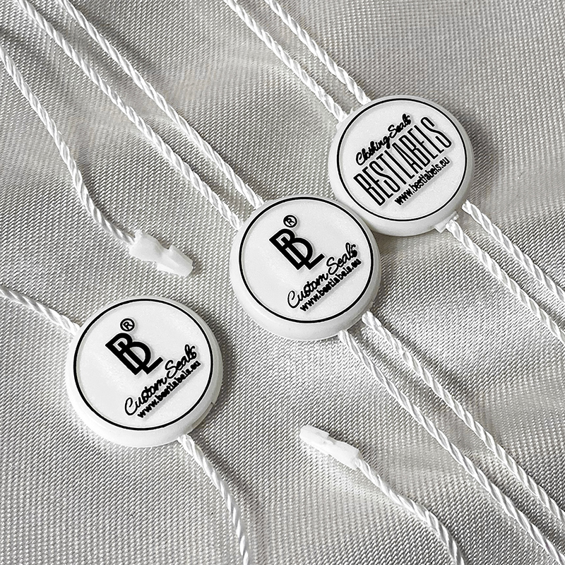 Sello de plástico ST-M91 con un diseño elegante, forma redonda, se puede personalizar en dos lados con el nombre de la marca o el emblema/marca registrada y es ideal para productos como ropa, bolsos, calzado. Este modelo de sello está hecho de materiales de alta calidad, utilizando las tecnologías más avanzadas en el campo.